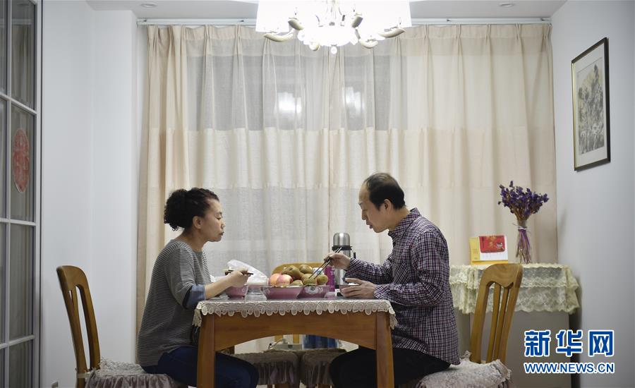 林学斌(右)在家和妻子吃晚饭(4月29日摄)。 新华社记者 姚剑锋 摄