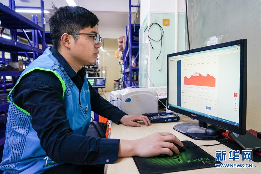 4月30日,在位于江苏省昆山市联滔电子厂内的菜鸟驿站,驿站站长魏琨正在通过电脑查询包裹入库单量走势图。 新华社记者 李博 摄