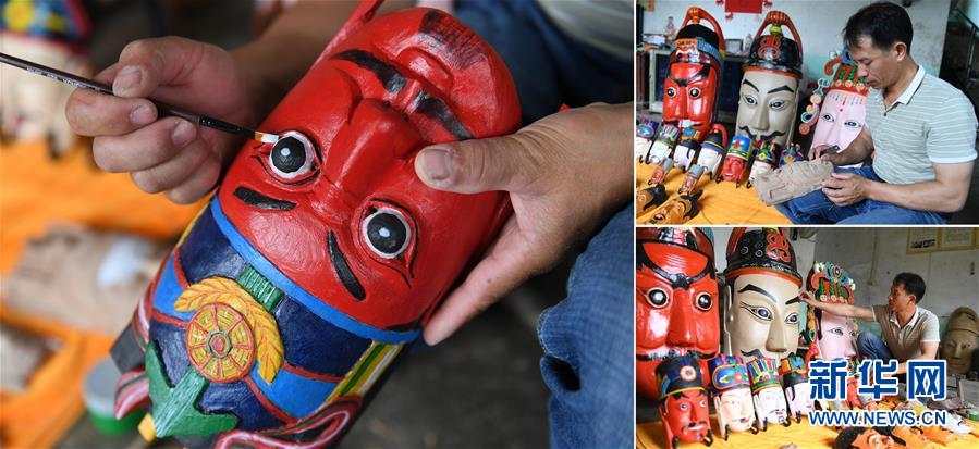 这张拼版照片显示的是2018年7月25日,广西环江毛南族自治县洛阳镇江口村大河屯农民方文展在制作、整理毛南族傩面。