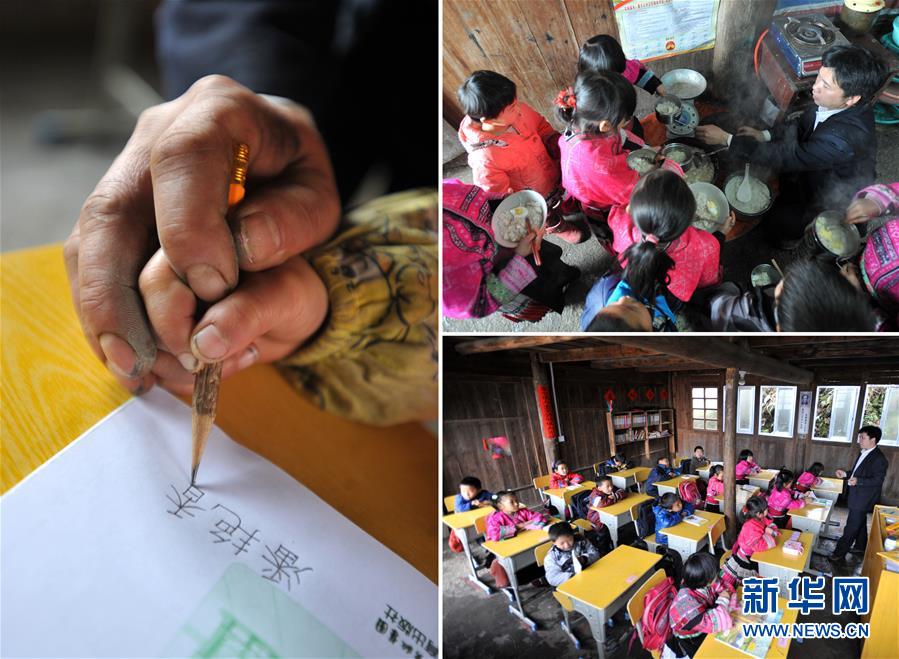 这是一张拼版照片。左图:在广西桂林市龙胜各族自治县龙脊镇江柳村翁江教学点,乡村教师余启贵握着一个学生的手教她写名字;右上图:余启贵在给学生分营养午餐;右下图:余启贵在给学生上课(2013年2月26日摄)。