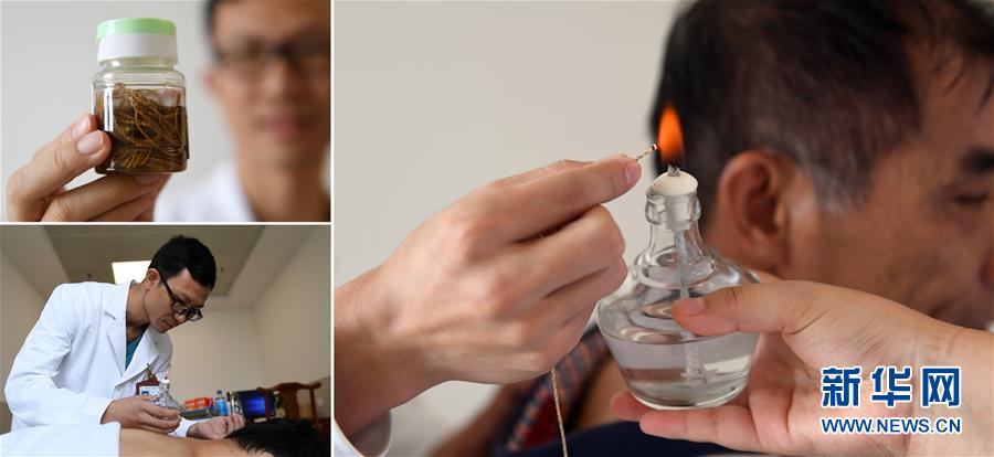这是一张拼版照片。左上图:广西国际壮医医院蒋桂江在展示壮医药线;左下图、右图:蒋桂江在为患者治疗(2018年9月7日摄)。