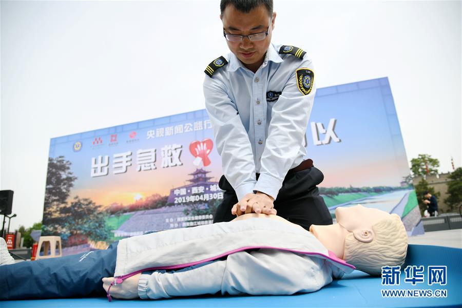 4月30日,西安急救中心医护人员在西安城墙景区演示心肺复苏。 当日,由西安急救中心主办的“出手急救 你也可以”主题培训活动在西安城墙景区举行。 “五一”小长假即将到来,西安急救中心医护人员针对旅游景区特点,将创伤包扎固定、心肺复苏、海姆立克急救法等培训项目在西安城墙景区进行公开示范,帮助景区工作人员和广大群众提高急救、自救和互救能力。 新华社记者 李一博 摄