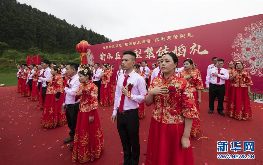4月30日,新人在集体婚礼上共同宣誓。 当日,江西省新余市渝水区46对青年男女在良山镇下保村举行集体婚礼。他们在青山绿水的见证下喜结连理,用行动倡导文明节俭办婚礼。 新华社发(赵春亮 摄)