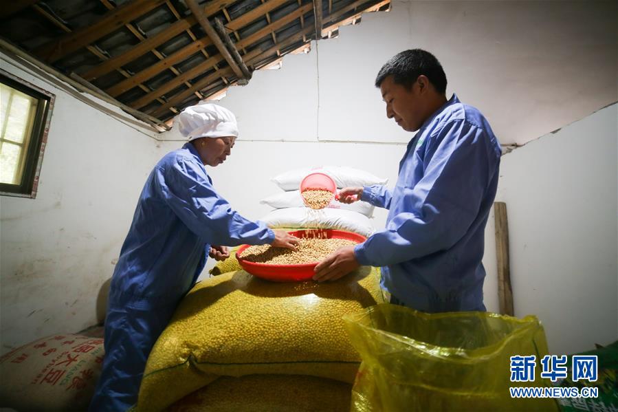 4月30日,在贵州省毕节市大方县对江镇龙场村大山深处的豆香源食品厂,胡从锋(右)拣选黄豆。 1983年出生在贵州省毕节市大方县对江镇龙场村的胡从锋,从小就喜欢吃家乡的豆干。2010年大学毕业后,胡从锋带着“让更多人能品尝到美味豆干”的梦想回到家乡,开始从事本地豆干的零售生意,由于他销售的豆干质地好,做人诚实守信,豆干的销量一度达到月售30余万片。为了能保证所售豆干的品质, 2017年胡从锋筹资30余万元在龙场村大山里建起了食品厂,坚持只用本地黄豆作为生产的原材料。他的食品厂生产的豆干味道纯正、口感细嫩,产品不光畅销省内外,还远销缅甸、泰国等地。 如今,食品厂日产豆干超过10万片,年产值达130万元以上,带动当地黄豆种植近千亩。在胡从锋看来,家乡的美味不能藏在大山里,要让豆干走出大山,为乡亲们带来更好的收益。下一步,胡从锋计划扩大生产规模,带领更多乡亲加入豆干产业,也让更多的人品尝到家乡美味。 新华社发(罗大富 摄)