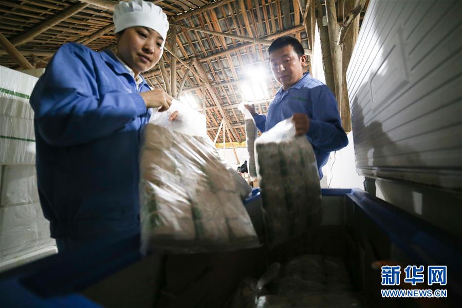 4月30日,在贵州省毕节市大方县对江镇龙场村大山深处的豆香源食品厂,胡从锋(右)将豆干打包。 1983年出生在贵州省毕节市大方县对江镇龙场村的胡从锋,从小就喜欢吃家乡的豆干。2010年大学毕业后,胡从锋带着“让更多人能品尝到美味豆干”的梦想回到家乡,开始从事本地豆干的零售生意,由于他销售的豆干质地好,做人诚实守信,豆干的销量一度达到月售30余万片。为了能保证所售豆干的品质, 2017年胡从锋筹资30余万元在龙场村大山里建起了食品厂,坚持只用本地黄豆作为生产的原材料。他的食品厂生产的豆干味道纯正、口感细嫩,产品不光畅销省内外,还远销缅甸、泰国等地。 如今,食品厂日产豆干超过10万片,年产值达130万元以上,带动当地黄豆种植近千亩。在胡从锋看来,家乡的美味不能藏在大山里,要让豆干走出大山,为乡亲们带来更好的收益。下一步,胡从锋计划扩大生产规模,带领更多乡亲加入豆干产业,也让更多的人品尝到家乡美味。 新华社发(罗大富 摄)