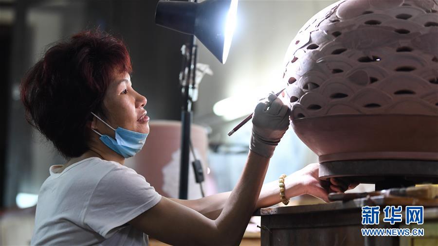 郭卉团队成员在制作坭兴陶作品(4月28日摄)。新华社记者 张爱林 摄