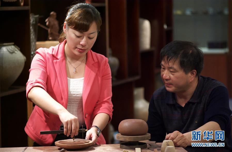 郭卉(左)与老师崔龙喜探讨制陶工艺(2010年4月20日摄)。新华社发