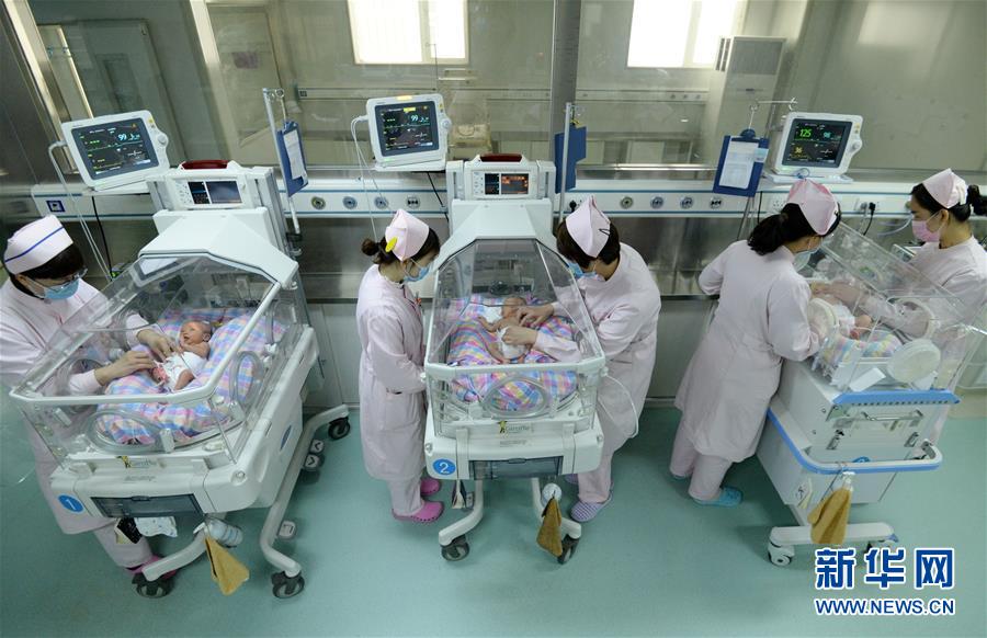 5月1日,河北省邯郸市第四医院儿科护士在为新生儿做护理。 当日是“五一”小长假第一天,各行各业都有依然忙于劳动的身影。 新华社发(郝群英 摄)