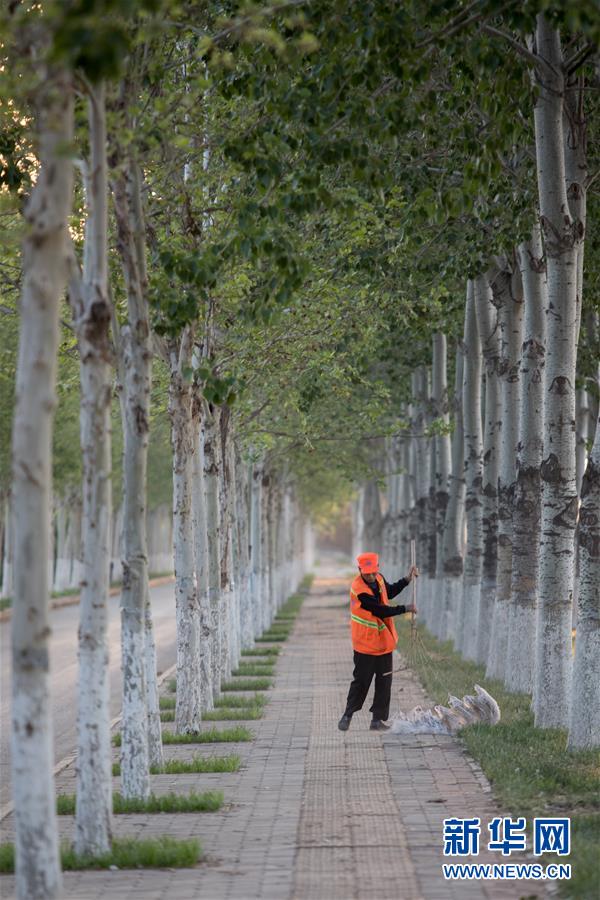 5月1日,一名环卫工人在山东省淄博市高青县的马路上劳作。 当日是“五一”小长假第一天,各行各业都有依然忙于劳动的身影。 新华社发(张维堂 摄)