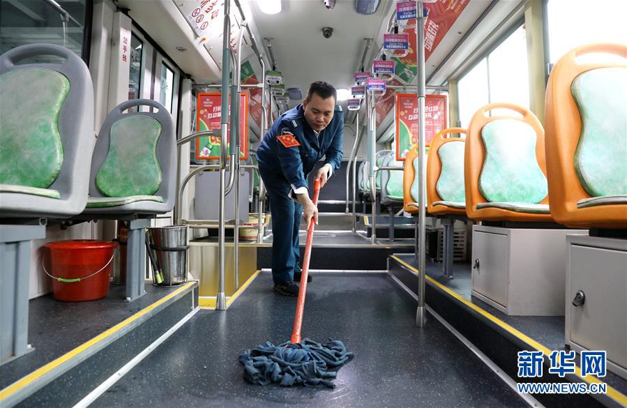 5月1日,石家庄市公交公司驾驶员陈建权在出车前打扫车厢。 当日是“五一”小长假第一天,各行各业都有依然忙于劳动的身影。 新华社发(梁子栋 摄)