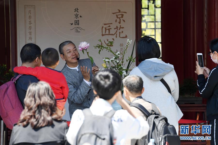 5月1日,来自北京插花协会的石磊在北京园内向参观者介绍插花知识。 当日,以“美丽北京 绽放世园”为主题的北京世园会“北京日”活动开幕,将于5月1日至3日举办近50场活动,重点展示北京生态文明建设成果、历史文化名城形象及现代国际大都市发展和对外交往成就。