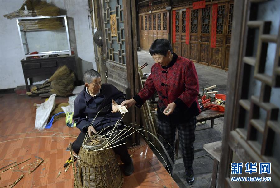 5月2日,在湖北省宣恩县椒园镇庆阳古街上,一名维修好篾货的妇女给王维和付款。 新华社发(宋文 摄)