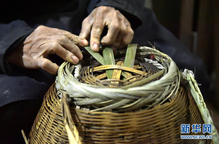 5月2日,在湖北省宣恩县椒园镇庆阳古街上,王维和在维修竹背篓底部。 新华社发(宋文 摄)