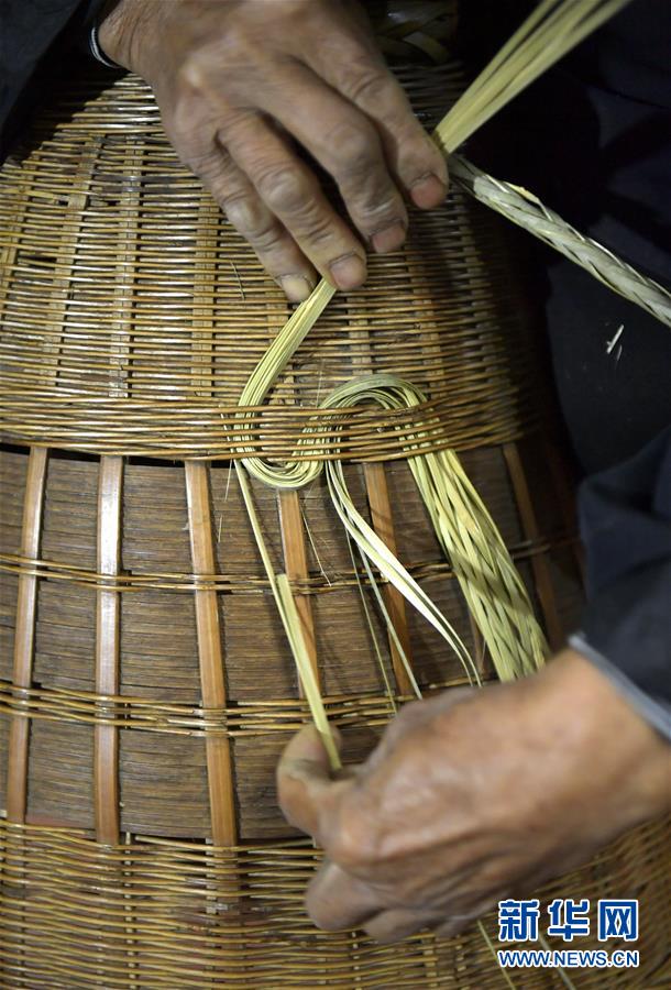 5月2日,在湖北省宣恩县椒园镇庆阳古街上,王维和用细竹篾修补竹背篓。 新华社发(宋文 摄)