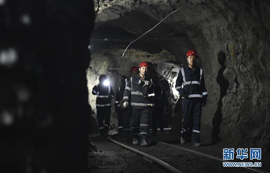鞍钢矿业公司弓长岭井下铁矿铲运机司机唐怀钰(右一)和工友一起走在铁矿矿道里(4月24日摄)。 新华社记者 姚剑锋 摄