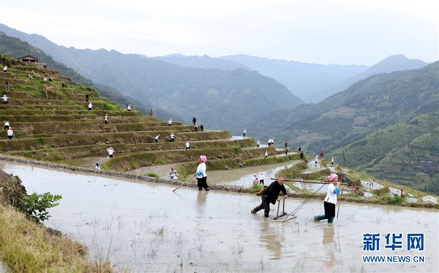 5月2日,在龙胜龙脊古壮寨,农民在梯田里劳作。 当日,广西龙胜各族自治县龙脊镇龙脊古壮寨举行“开耕节”,拉开龙脊梯田春耕春播的序幕。 新华社发(粟勇主 摄)
