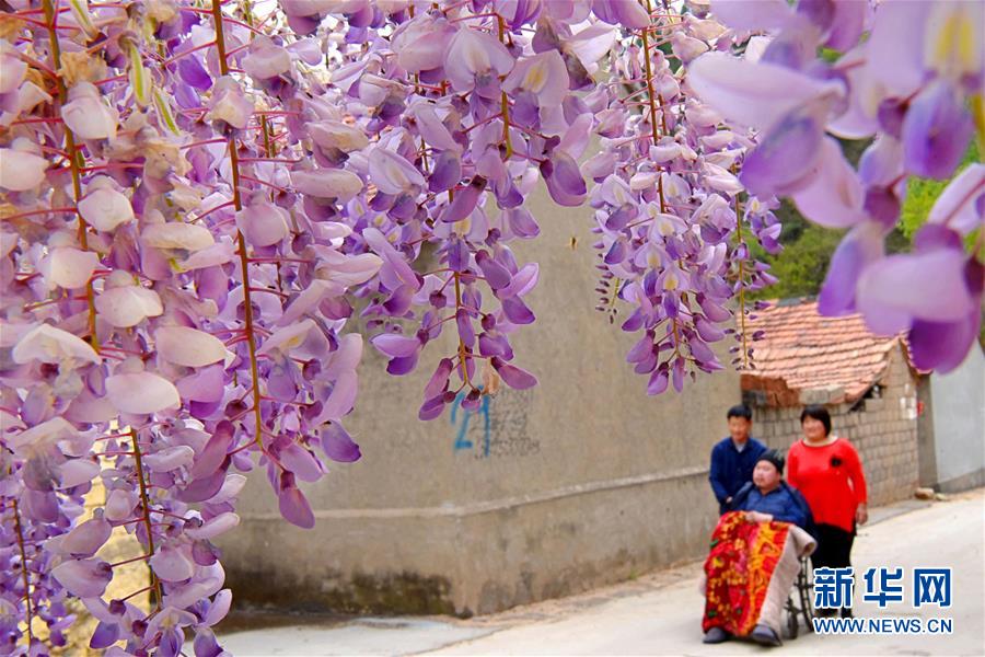 4月28日,郑作霞与丈夫王寿法一起推着前夫乔峰到户外散心。 新华社发(赵东山 摄)