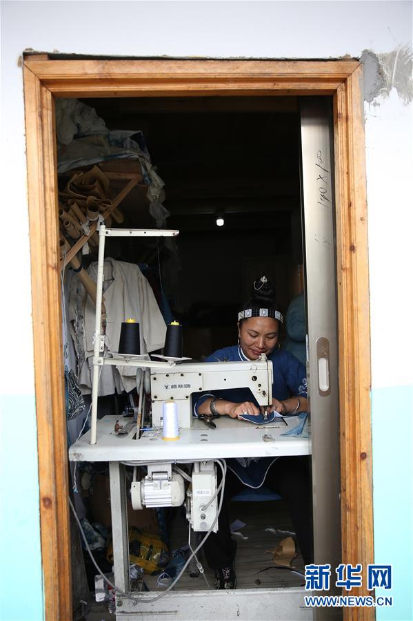 5月2日,在贵州省丹寨县扬武镇排莫村“明秀蜡染坊”,张世秀把艺术作品进行拼接。