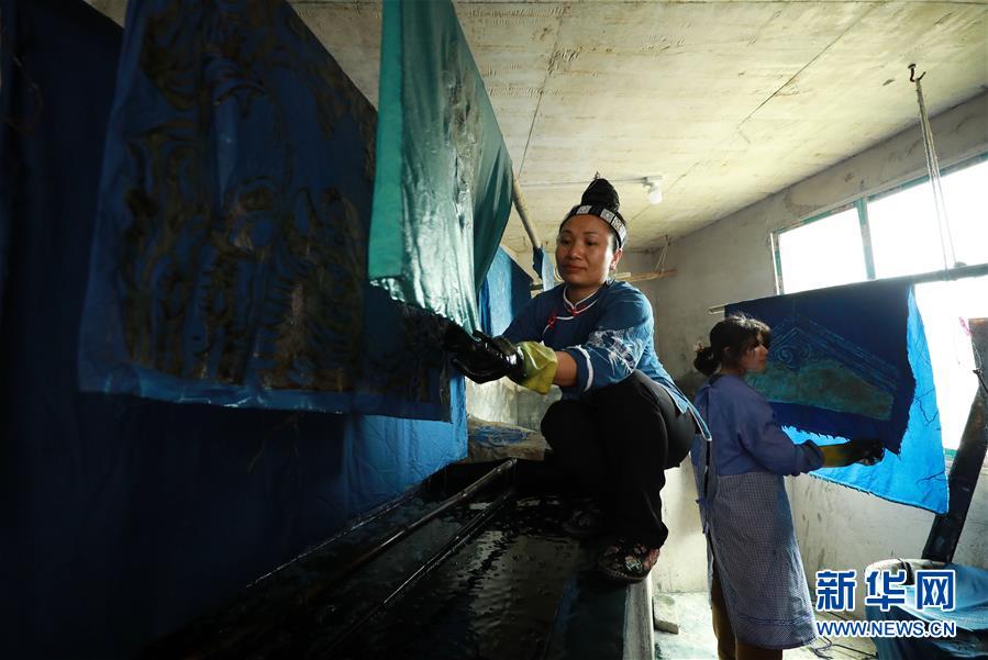5月2日,在贵州省丹寨县扬武镇排莫村”明秀蜡染坊“染布室,张世秀(左)和艺术家一起把画好的艺术作品晾水。