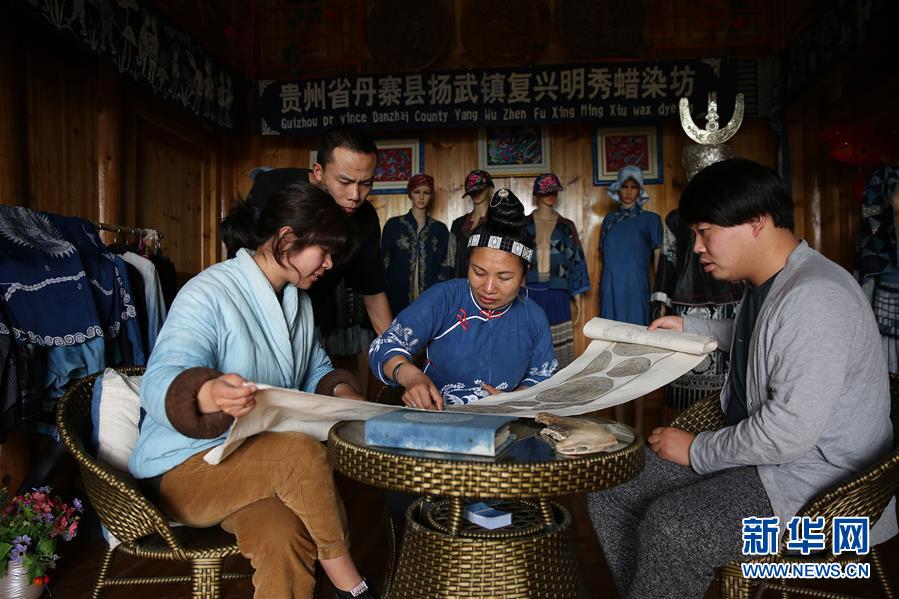 5月2日,在贵州省丹寨县扬武镇排莫村”明秀蜡染坊“展览室,张世秀(右二)向艺术家们介绍传统蜡染图案的绘画手法。