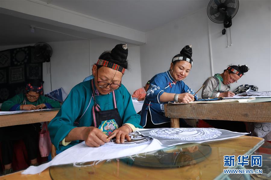 5月2日,在贵州省丹寨县扬武镇排莫村”明秀蜡染坊“蜡画室,张世秀(前中)和苗族蜡染画师一起把艺术家的作品绘制成蜡画。