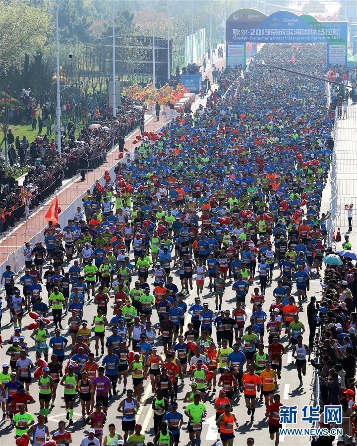 5月3日,2019荣成滨海国际马拉松参赛者在山东省荣成市体育中心开跑。