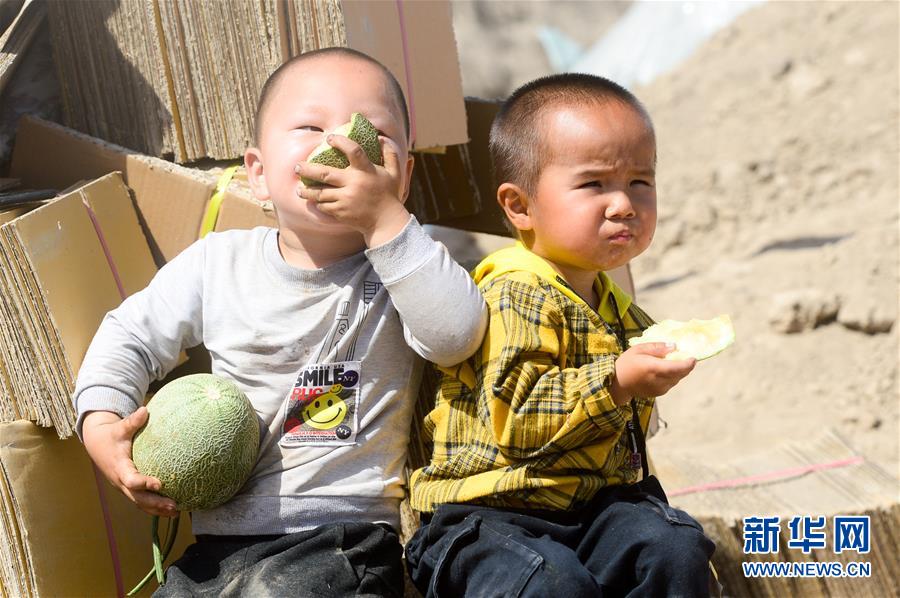 5月3日,在吐鲁番市鄯善县辟展镇,两名小朋友在品尝哈密瓜。