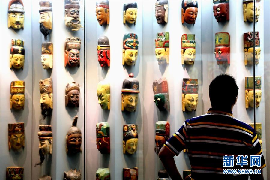 5月3日,参观者在广西民族博物馆观赏毛南族木面具。