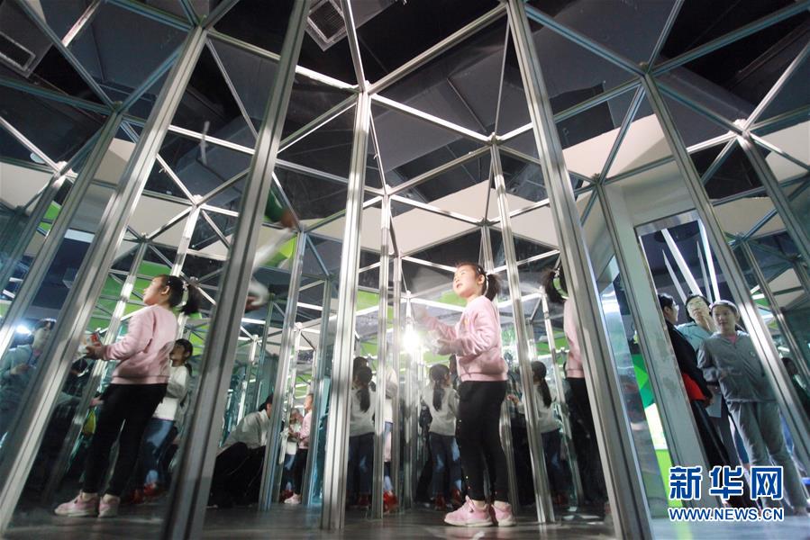5月3日,参观者在江苏省扬州科技馆体验“镜子迷宫”。