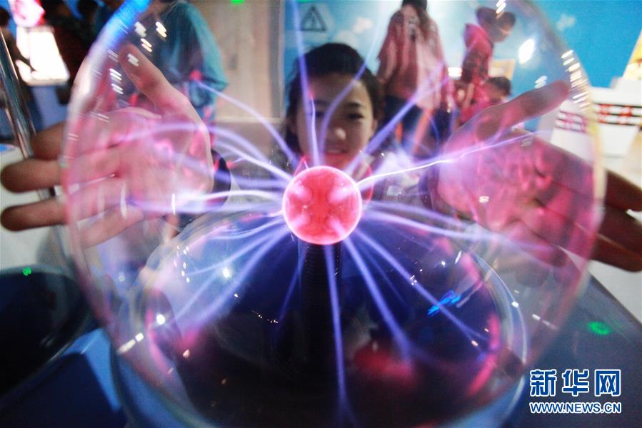 5月3日,小朋友在江苏省扬州科技馆体验“辉光球”。