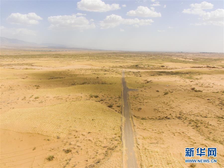 今年三月份吴向荣和工人在阿拉善左旗腾格里沙漠东缘打下的沙障(5月1日无人机拍摄)。新华社记者 刘磊 摄