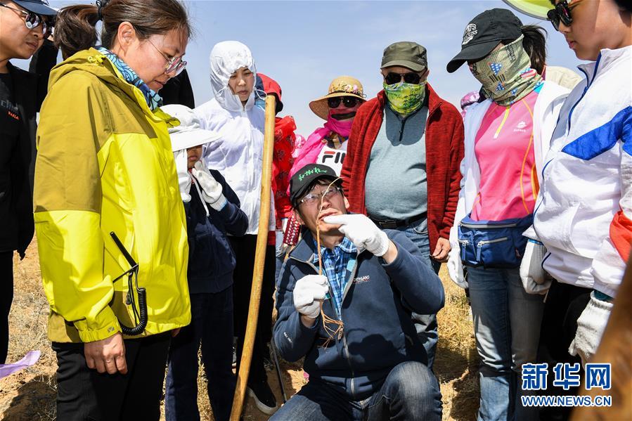 5月2日,在阿拉善左旗腾格里沙漠东缘,吴向荣在教种树志愿者如何种植沙生植物。新华社记者 刘磊 摄