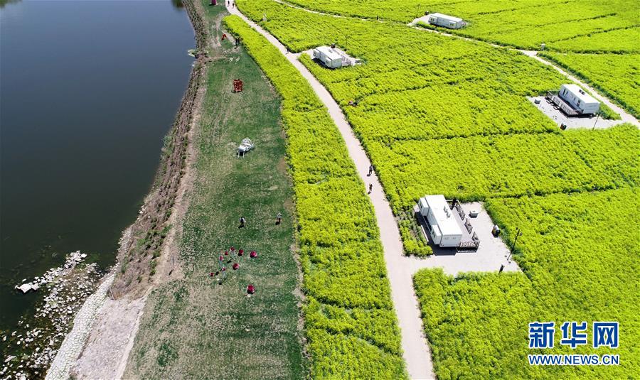 无人机拍摄的天津武清郊野公园的油菜花和房车(4月30日摄)。