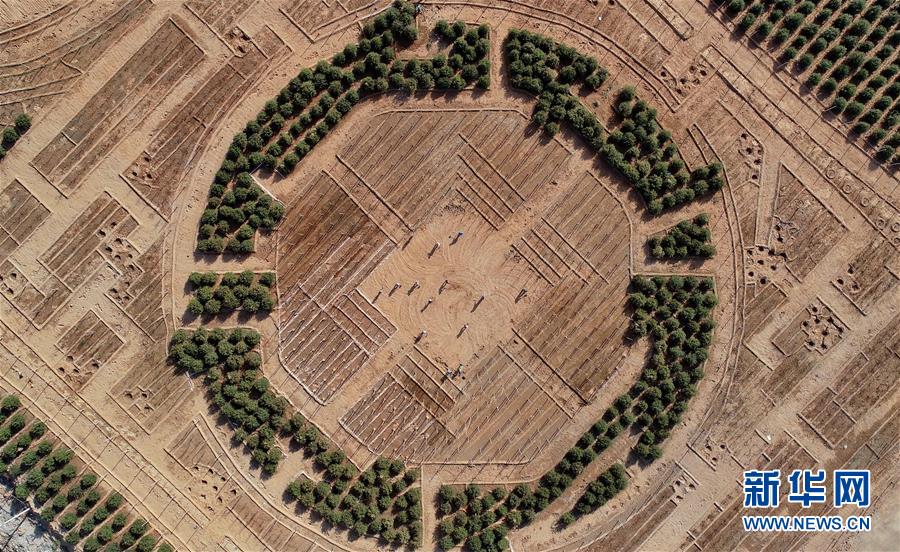 工人在河北省迁安市蔡园镇金岭铁矿生态综合修复项目施工现场植树(5月2日无人机拍摄)。
