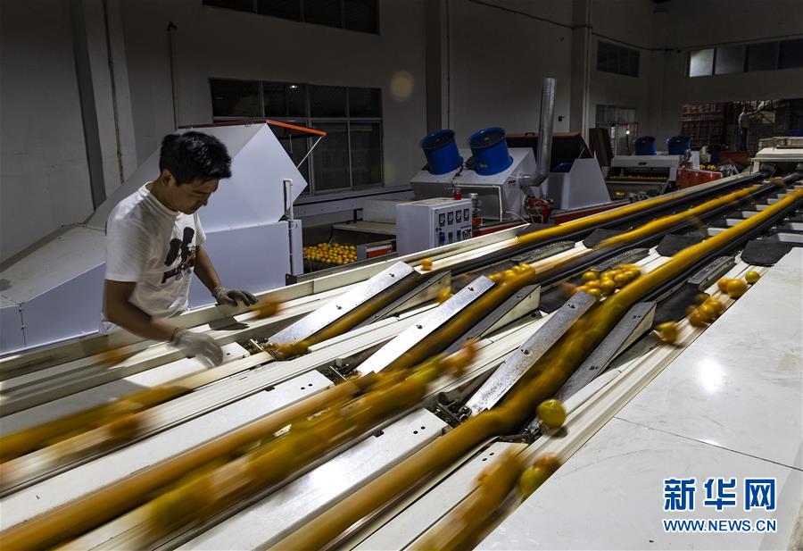 5月3日晚,郑云波在秭归县城一洗果生产线上工作。新华社发(郑家裕 摄)