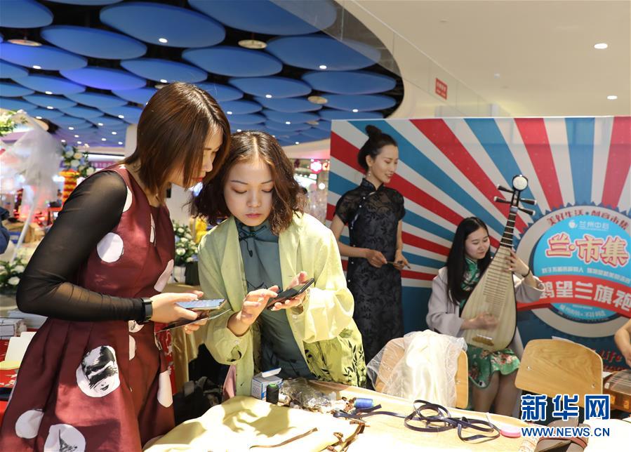 在兰州“创意市集”鹤望兰旗袍工作室的展位旁,曲绍丽(左二)用手机向观众展示自己设计的旗袍(5月1日摄)。 新华社发(李杰 摄)
