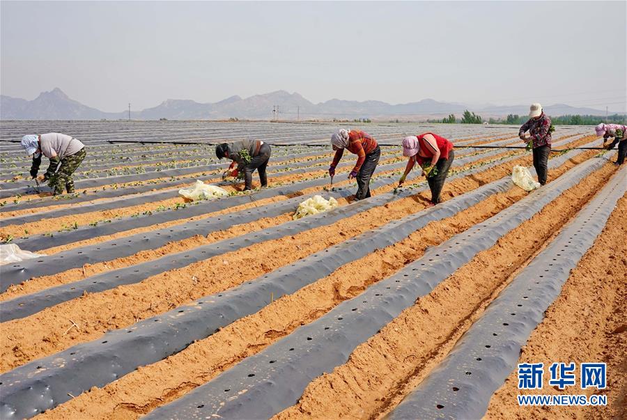 5月4日,卢龙县双望镇四新庄村的村民在田间栽植鲜食型甘薯秧苗。