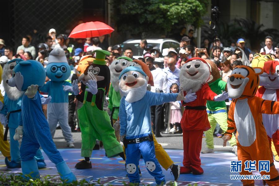 5月4日,演员装扮成各种动漫形象在巡游队伍中表演。当日,第十五届中国国际动漫节彩车巡游活动在浙江杭州南宋御街中北创意街区举行。巡游表演队伍约500米长,由4辆大型动漫彩车、1辆小火车及400多名演员组成。新华社记者 黄宗治 摄