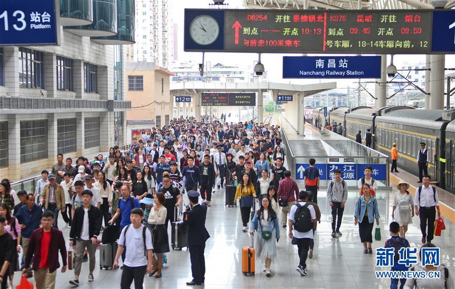 5月4日,旅客在南昌火车站准备出站。 当日是“五一”假期的最后一天,各地迎来返程客流高峰。 新华社发(张学东 摄)
