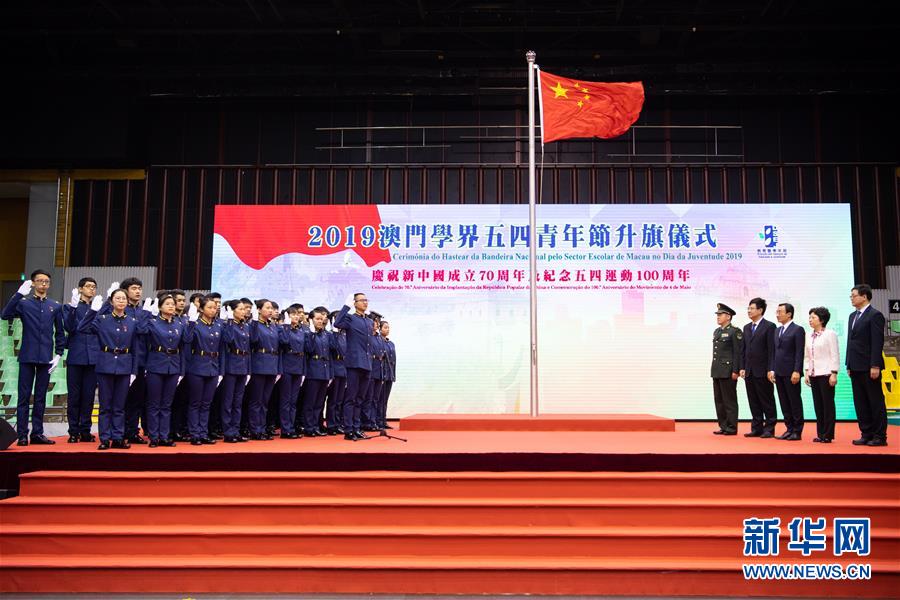 5月4日,“澳门学界升旗队”队员集体宣誓。 当日,澳门学界在综艺馆举行青年节升旗仪式,隆重纪念五四运动100周年。来自澳门82所学校的师生、28个青年社团的代表,以及社会各界人士2000多人参加升旗仪式。 新华社记者 张金加 摄