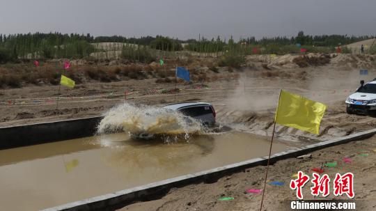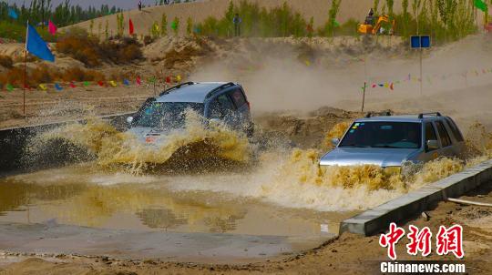 参赛选手经过涉水场,溅起水花。 王小军 摄