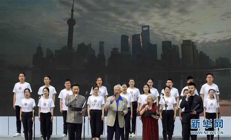 5月4日,艺术家陈铎(前左二)、虹云(前右二)在青春诗会上带领大家朗诵诗歌《读中国》。当日是五四运动100周年纪念日,北京大学在校园内的静园草坪举办“百年追梦路,时代圆梦人”北京大学纪念五四运动100周年青春诗会,诗诵祖国,诗诵青春。新华社记者 沈伯韩 摄