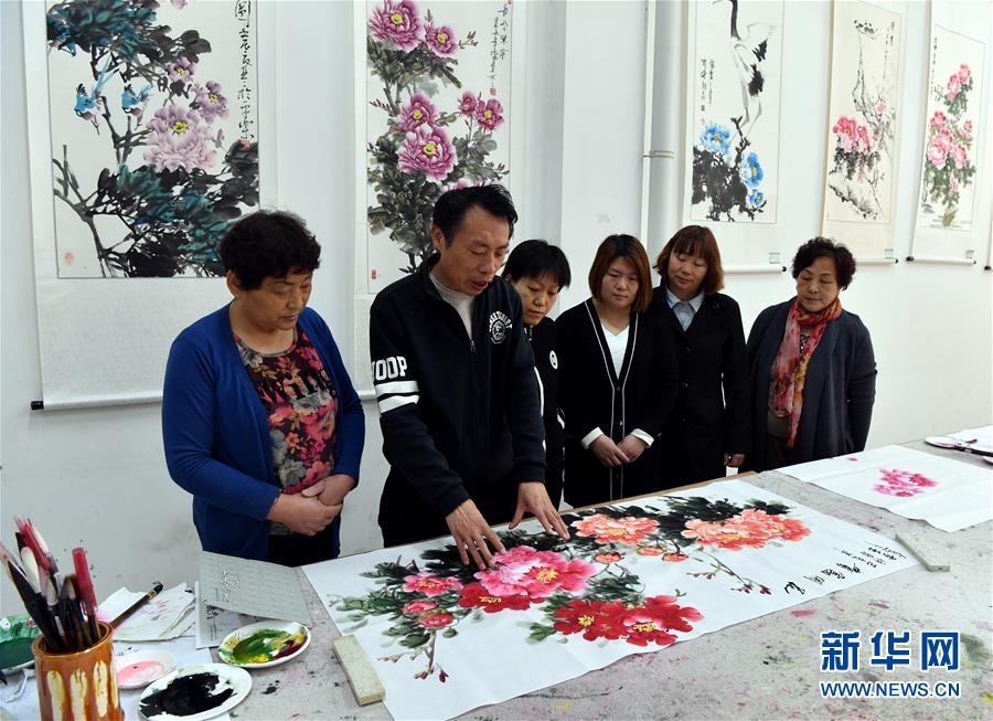 画家在中国平乐牡丹画创意园区为画师讲解绘画技巧(4月25日摄)。新华社记者李嘉南摄