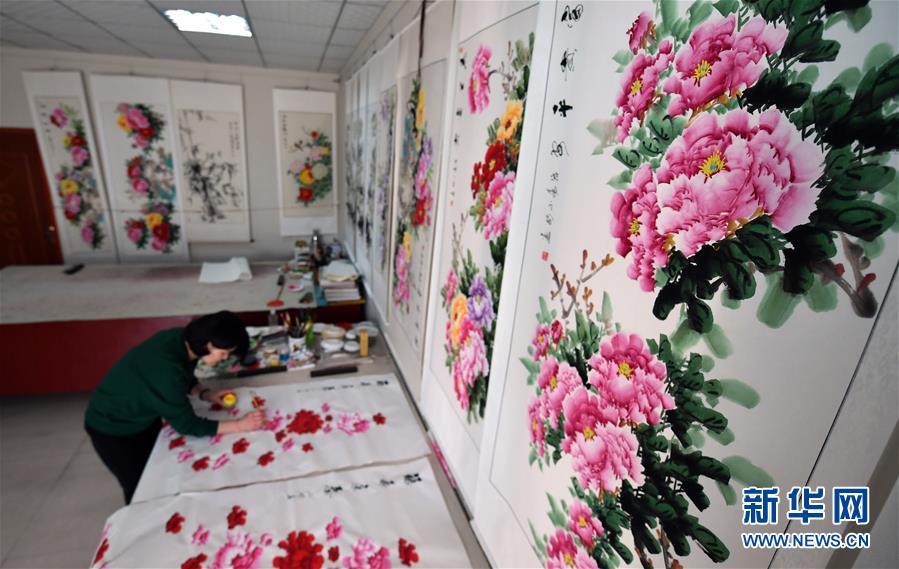 画师在中国平乐牡丹画创意园区进行创作(4月25日摄)。新华社记者李嘉南摄