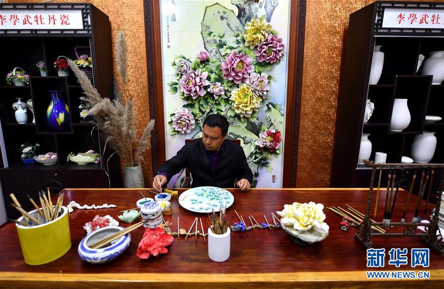 牡丹瓷创始人李学武在为牡丹瓷半成品勾线(4月25日摄)。新华社记者李嘉南摄