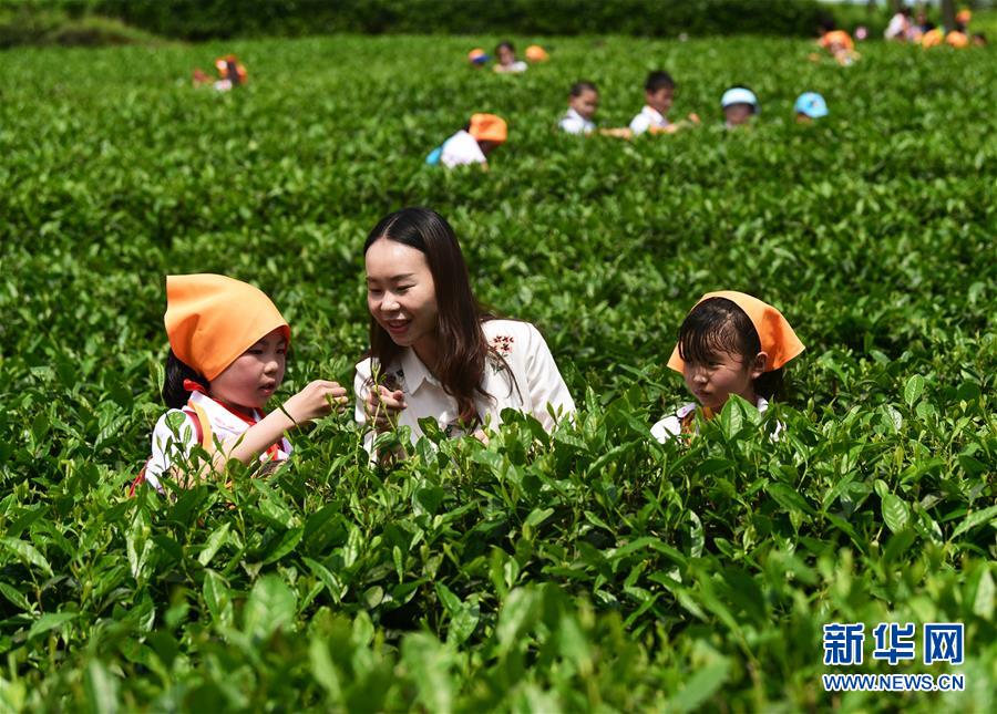 4月25日,张璐(中)在定心茶园标准化茶叶基地内指导小学生采摘春茶。新华社记者 王全超 摄