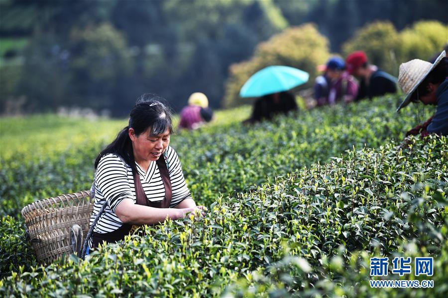 3月18日,茶农在定心茶园标准化茶叶基地内采摘春茶。新华社记者 王全超 摄