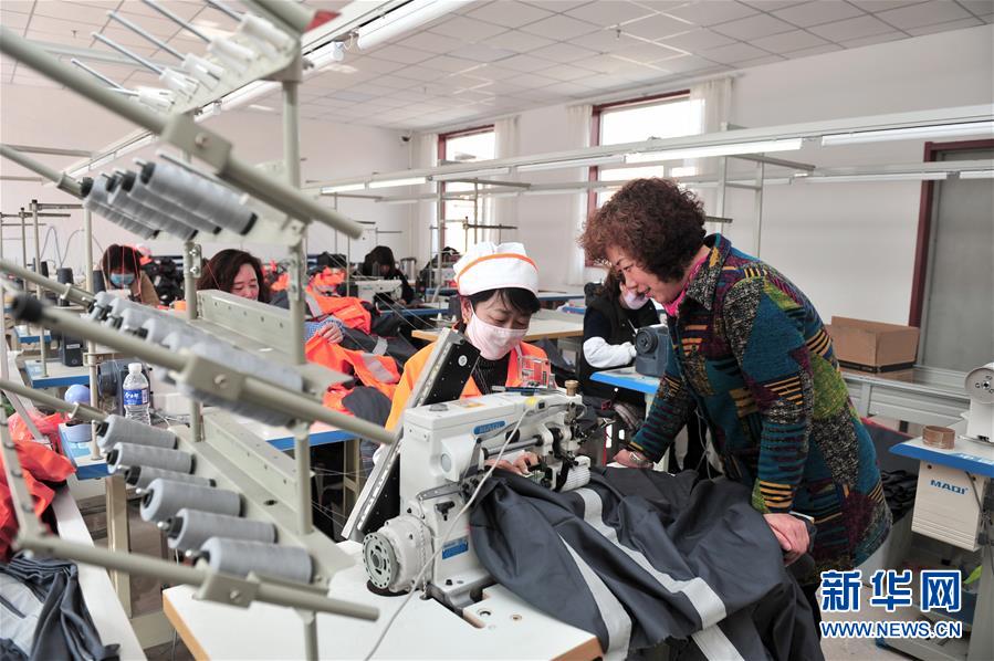 5月5日,在承德市鹰手营子矿区姚家庄村“扶贫车间”,老工人(右一)指导新工人加工服装。 新华社记者 金良快 摄