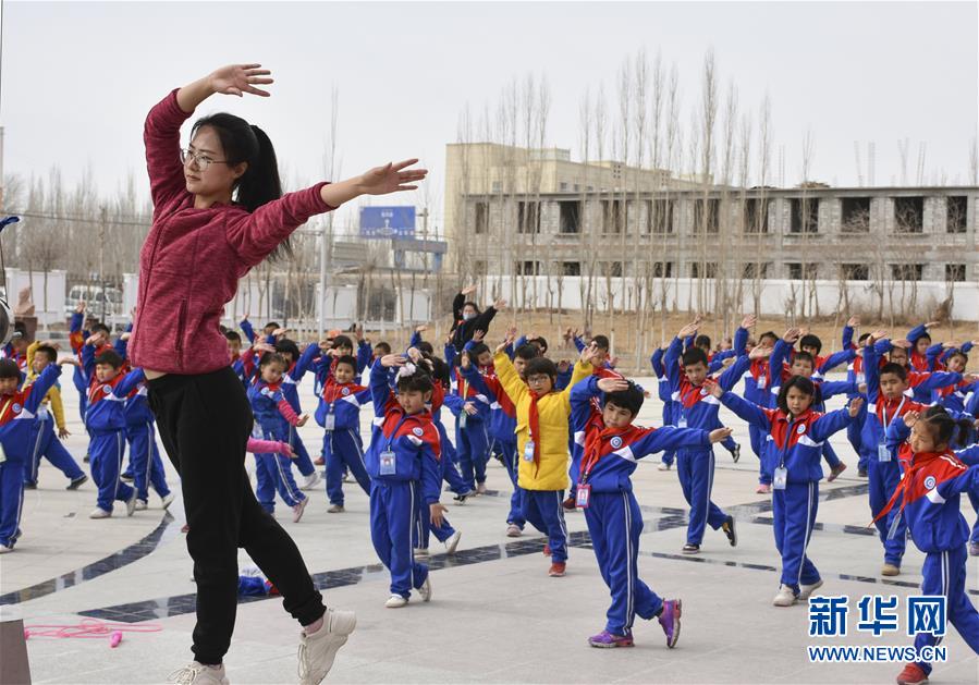 在新疆且末县第二小学,2018年来到且末县第二小学担任体育老师的张婷(前)带领孩子们练习体育组老师自编的广播操(3月15日摄)。 新华社记者 段敏夫 摄