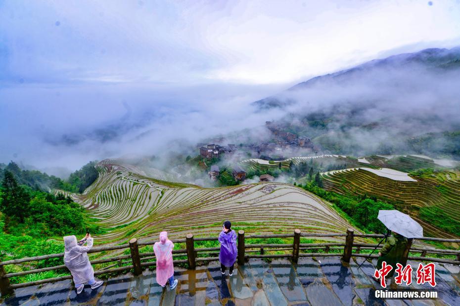 这是5月5日,游客在广西桂林市龙胜各族自治县龙脊梯田观光游览。目前,广西桂林市龙胜各族自治县龙脊梯田进入全面备耕季节,梯田水满田畴,雨后云雾缭绕,开启今年最佳的观光和摄影模式。潘志祥 摄